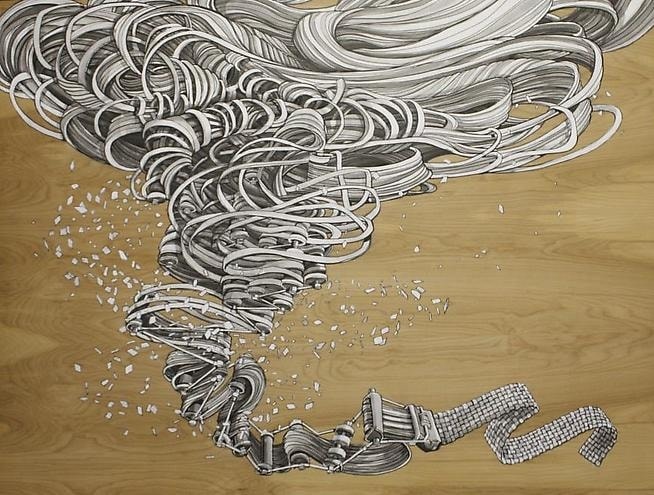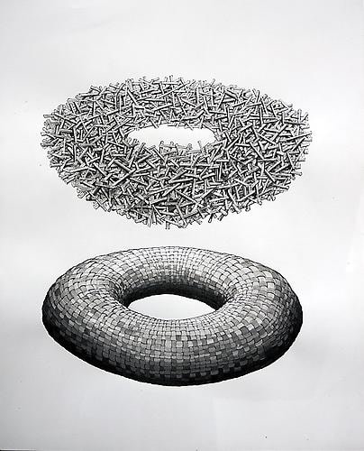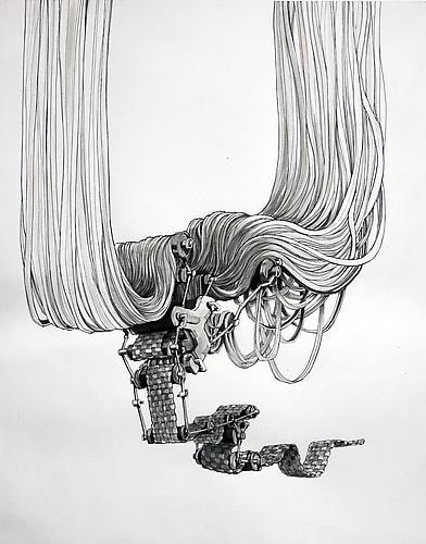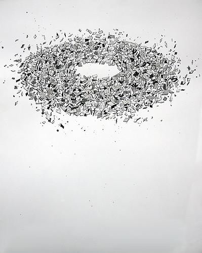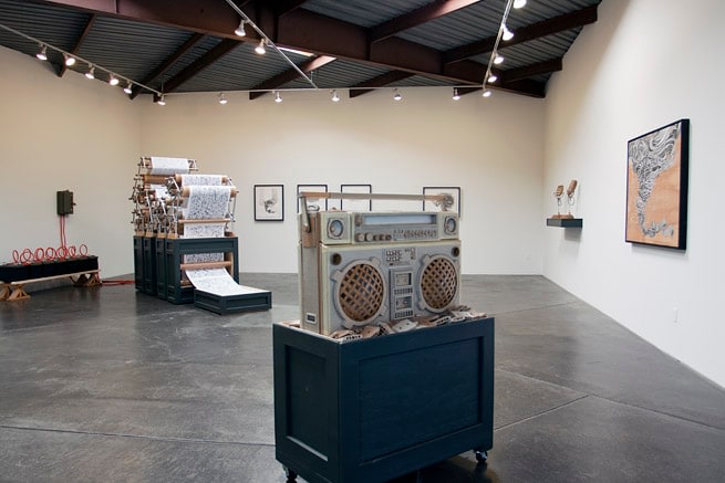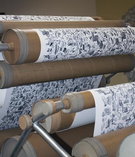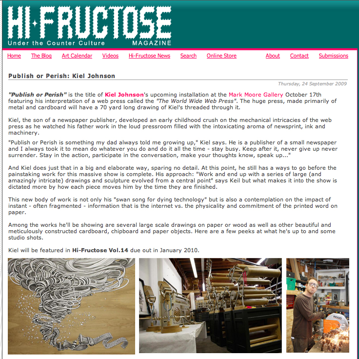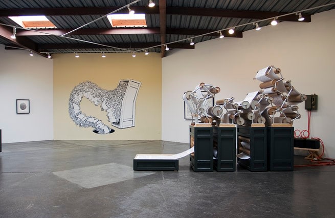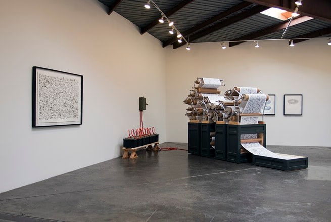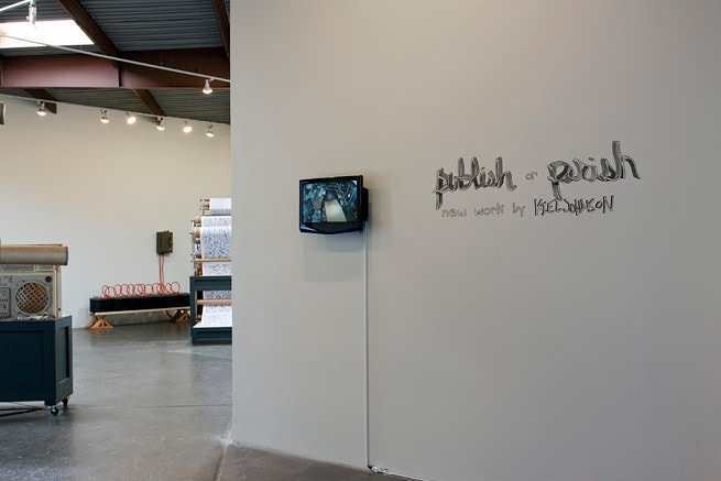 Deviating from his trademark cardboard medium, Johnson presents an altogether different exhibition born of obsessive personal inventory and astute social commentary. Publish or Perish illustrates the rapid expansion of globalized communication and the subsequent dichotomy of a retracted sense of interaction despite a heightened sense of interconnectivity. Using the printing press as the overarching figure of information's evolution, Johnson constructs a type of archival environment that denotes the transformation of our personal relationships to the tangible, the local and the sentimental. Johnson's distinctive fascination with mechanization and fine intricacies is embodied in both his construction of an "autobiographical" printing press, and his meticulous ink renderings, which demonstrate the compulsive human need to produce, document, proliferate and authenticate histories – much like the artist himself.