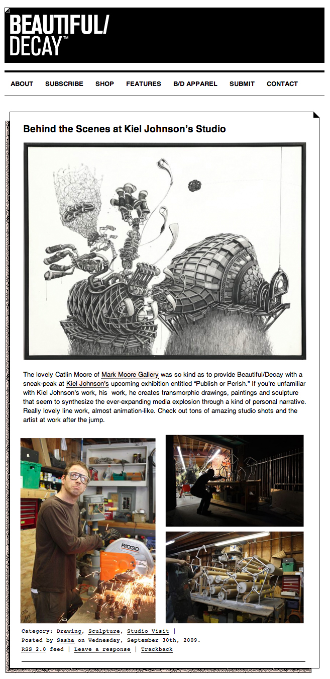 Following up his 2008 inaugural solo show with Mark Moore Gallery, Kiel Johnson invites us to step inside his compellingly prolific imagination with several new drawings and a large-scale sculptural installation.