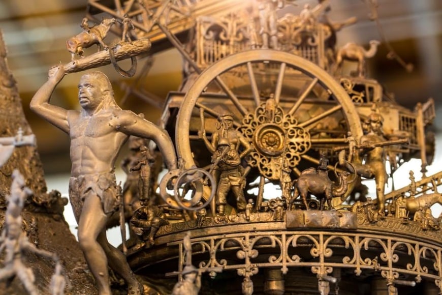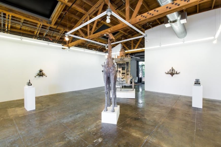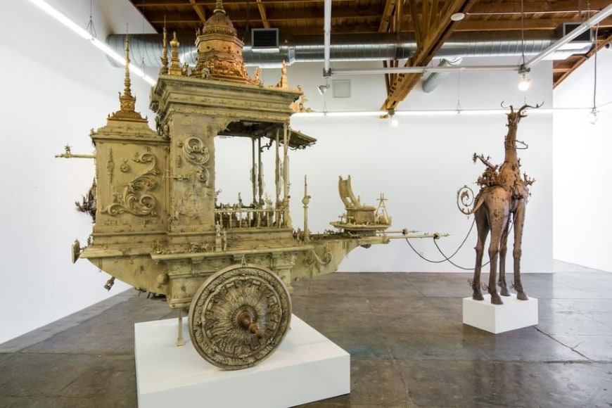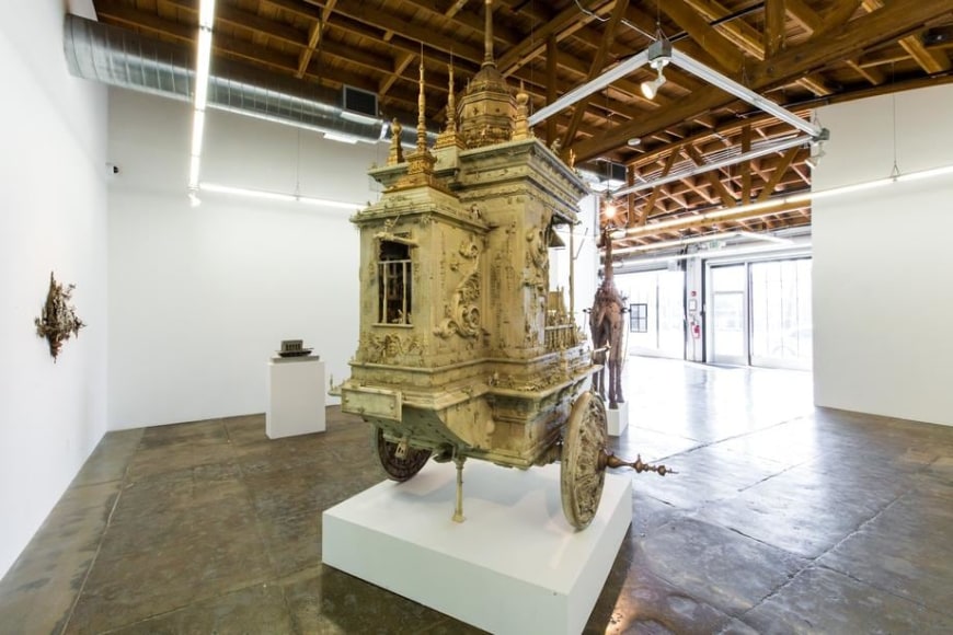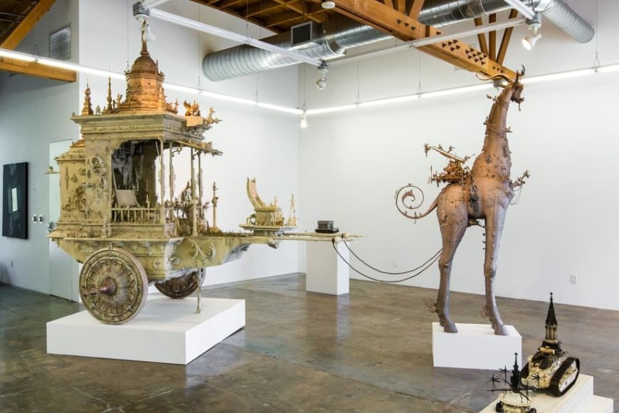 Over the last decade, Kuksi has built a career creating complex sculptures that blend antiquity with the modern world. Teeming with struggle, conflict, faith, sexuality, and power, each sculpture affords the viewer a ringside seat for a wild spectacle as the spheres of fantasy and reality collide. For this exhibition, Kuksi creates New Rome, a society rife with allegory consisting of works crafted in a hybrid style of baroque and rococo that deeply examine the human psyche. Every sculpture is created from an obsessive collection of cultural flotsam and jetsam – figurines, model parts, collectibles, craft parts, and jewelry. The final pieces, sometimes as large as 10Ft wide, are totemic like shrines that expose Kuksi’s disenchantment with the structures of power and the fallacies of man. Yet, the works are not without their romance, as the wonders of the world are presented through elaborate entanglements of miniature bears, mythical beasts, and glorious figurines. In the Los Angeles Times review of Kuksi’s 2014 exhibition David Pagel writes, “Kuksi’s Baroque confections treat history as primordial soup — a burbling stew of thrilling highlights and epic tragedies that not only resonate in the mind’s eye but also inspire all sorts of emotions — good, bad and otherwise.”