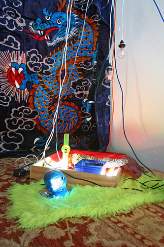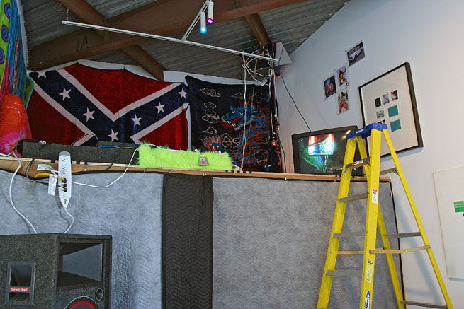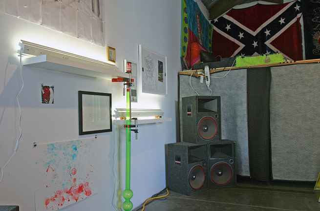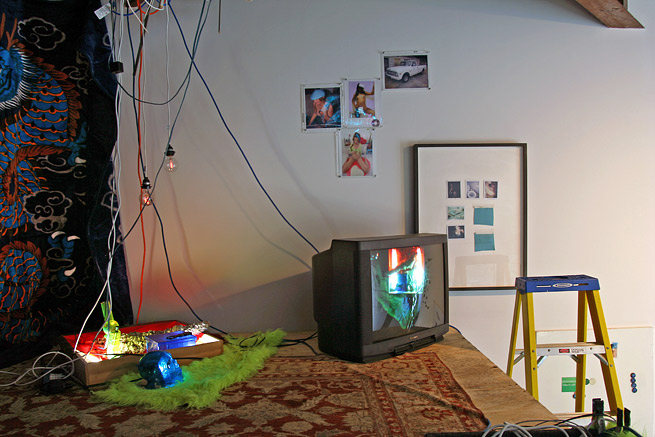The exhibition will consist of a two-part installation taking place in the gallery’s interior project space and in front of the gallery between two travel trailer campers. The work is an exploration of coded manipulations in consumer culture and is presented in satire of systematic healing through consumption of material objects and entertainment. The interior space will contain various monitors and a single projection with new and older original video works as well as commercial pornographic material. Additionally the environment will have materials and objects that manipulate lighting sources and marry conventions of club atmosphere, day spa chic, and seedy peepshow claustrophobia. The external section of the exhibition is intended to frame boundaries for a flea market with vintage modernist furniture and other odd and random selections from area collections and prop houses. The trailers will also continue nuances contained in the interior gallery space.