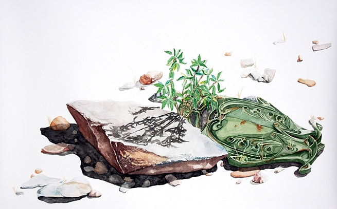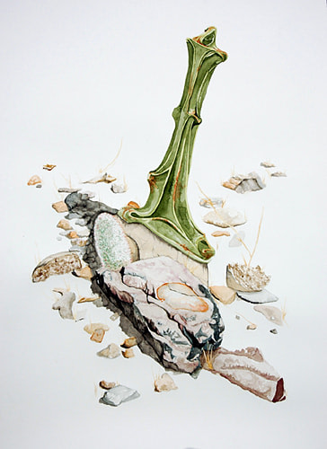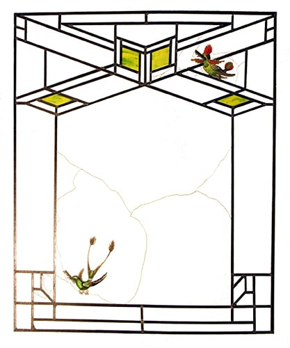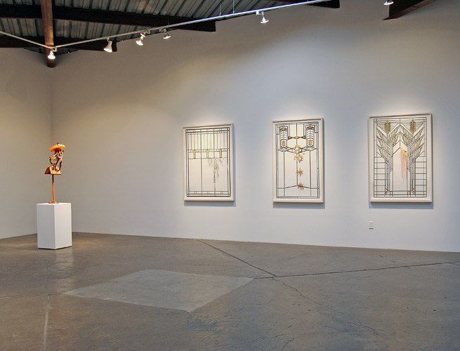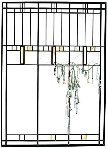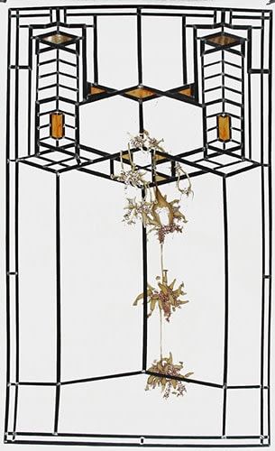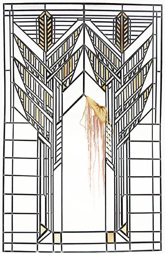 In Taber’s Light Screen series, graphite and watercolor render neglected Frank Lloyd Wright windows that once mediated his patrons’ views of the world outside of his enclave. Appropriating illustrations of marine life by the nineteenth century Natural Philosopher Ernst Haeckel, Taber’s broken panes become host to a series of miraculous vandals, various species of Haeckel’s Hydrozoa.