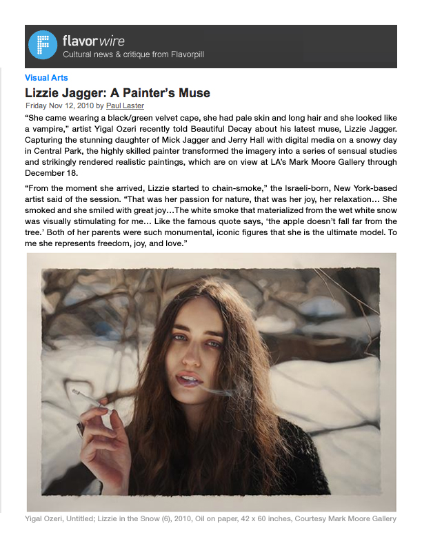 "It's the mimetic aspects of Ozeri's work that retain a grip on the imagination; it's his fine rendering of leaves, branches, flesh, long tangled hair and fabrics, like wool and silk, that you can almost touch and smell, as well as his vivid palette of reds, golds, pinks, creams, violets and woodsy hues. The images have the added piquancy of media trompe l'oeil – are they photographs or are they paintings?" - Lilly Wei, ARTnews (2009)