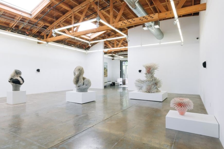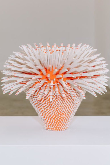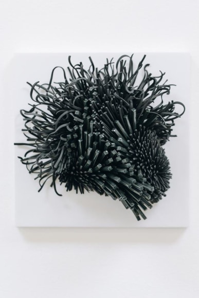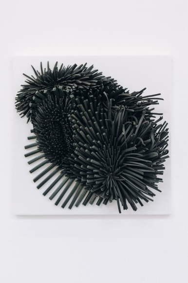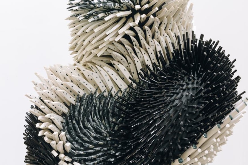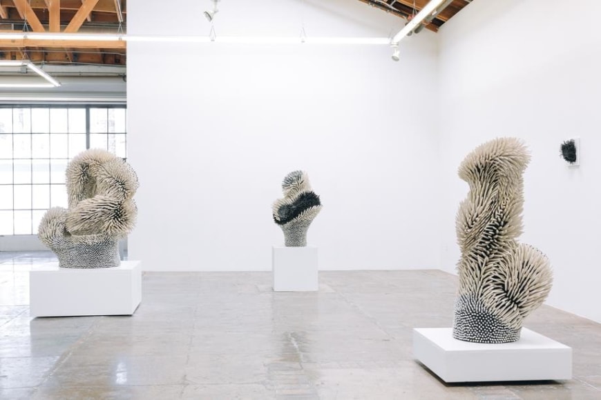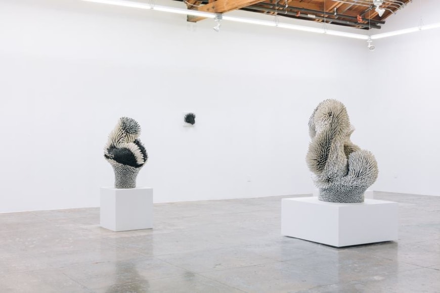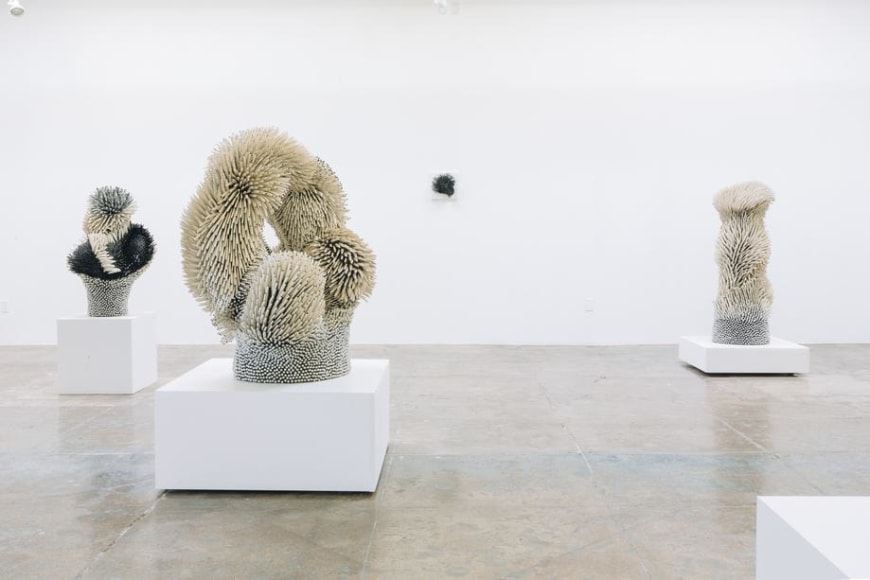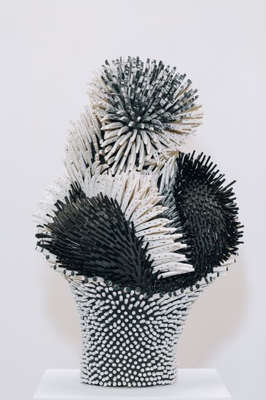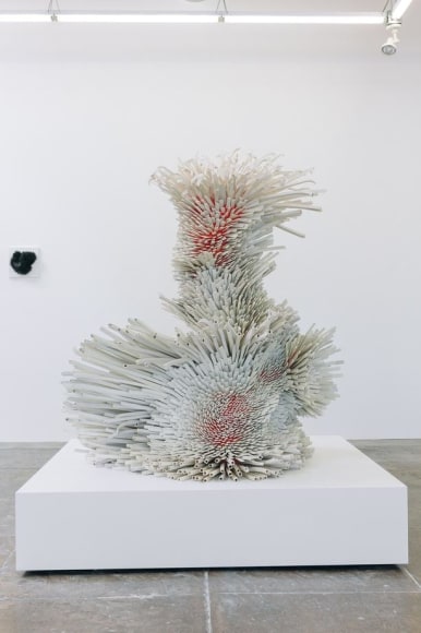 Using white and colored porcelains, Peled transforms sharp slivers of porcelain into feathers, petals, leaves, and spines that describe objects of unknowable origins: seductive but untrustworthy. The forms are complexly ordered from the inside out, often bulging or spilling over with textures both delicate and severe. In some works, large scale-like ceramic pieces appear airy, delicate, and fluffy, as if one's breath might break it. In others, Peled's fragments are geometric barbs that mysteriously take on an alluring form - offering a sense of softness despite a sharp actuality. The forms are never static; the visual dance of sharp ceramic parts conveys a sense of constant movement. Like a murmuration of starlings, the sculptures appear to shift shapes as you move around them, an identity becoming and unbecoming in front of you.