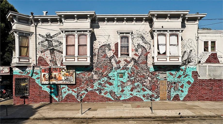 Andrew Schoultz, the artist that never sleeps, has completed yet another mural in his native San Francisco. Located at 24th and York Street, the mural spans the length of Pop’s Bar – one of the neighborhood’s favorite establishments. Complete with his trademark horses, flags, falling bricks, and telephone poles, the work will undoubtedly be a Schoultz signature for years to come.