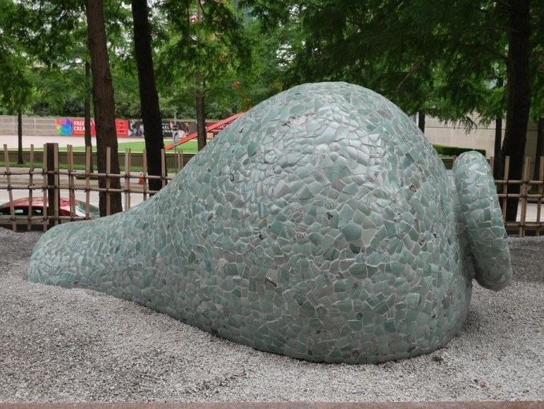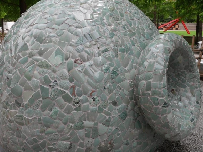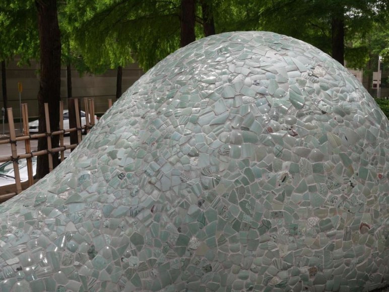 Jean Shin’s new monumental site-specific sculpture for The Crow Collection of Asian Art Sculpture Garden references the shape of a Korean celadon vase, constructed from ceramic discards collected from numerous kilns in South Korea. These shards are the result of potters destroying finished ceramic vessels with any minor imperfections. As an immigrant from Seoul who was raised in America, Shin views the celadon fragments as a metaphor of the Korean diaspora, vibrant artifacts of the Korean people, their history and culture that are scattered all over the world to form new identities elsewhere.