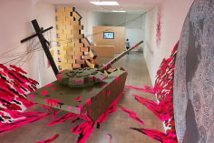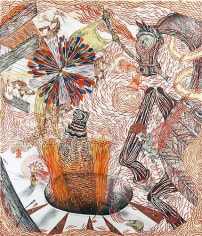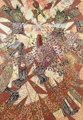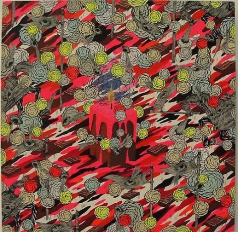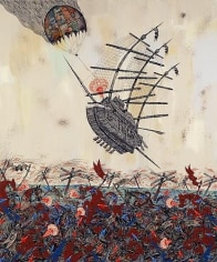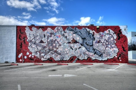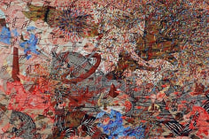 Sourcing inspiration from 15th Century German map making and Indian miniature paintings, Andrew Schoultz's frenetic imagery depicts an ephemeral history bound to repeat itself. In his mixed-media works, notions of war, spirituality and sociopolitical imperialism are reoccurring themes, which shrewdly parallel an equally repetitive contemporary pursuit of accumulation and power. Intricate line work, painting, metal leaf and collage twist and undulate under Schoultz's meticulous hand, ranging from intimately sized wall works to staggering murals and installations. While his illustrated world seems one of chaos and frenzy, Schoultz also implies a sense of alluring fantasy and whimsy - a crossroads vaguely familiar to the modern world.