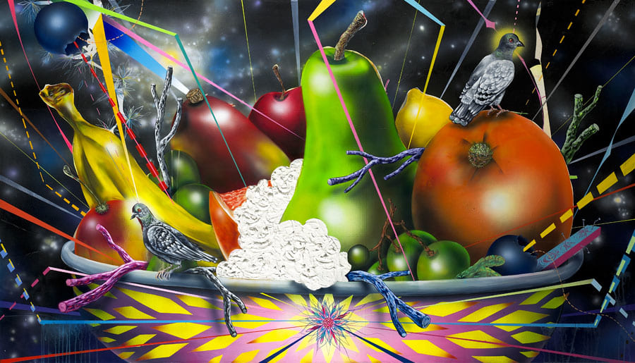 Spacey Still-life with Protective Pigeons, 2009 / Mixed media on canvas / 84 x 48 inches