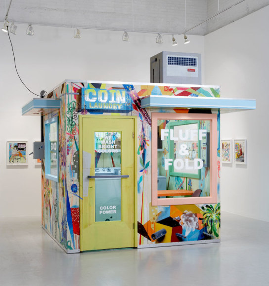 Working from their Los Angeles studio, the Clayton brothers draw inspiration from their immediate environment by incorporating local businesses, neighborhood regulars, and snippets of overheard conversations as subjects for their paintings. Composing their pieces in conjunction with one another, recurrent motifs, gestures, places, and figures appear within different works; creating the drama of linked experience. Set upon collaged canvases, the physical layers of their surfaces create a condensed tableaux. The brothers approach painting as a visual representation of pure energy: everyday scenes explode in vortexes of blinding color, movement is practically animated, and products make their placement, an effect similar to viewing every frame of a film simultaneously. In presenting a specific locality, the Clayton brothers relate the personal to the global, but still offer a vision of "America-as-it-is." In turn, they celebrate and share all of its diverse, spectacular, and solitary splendor.