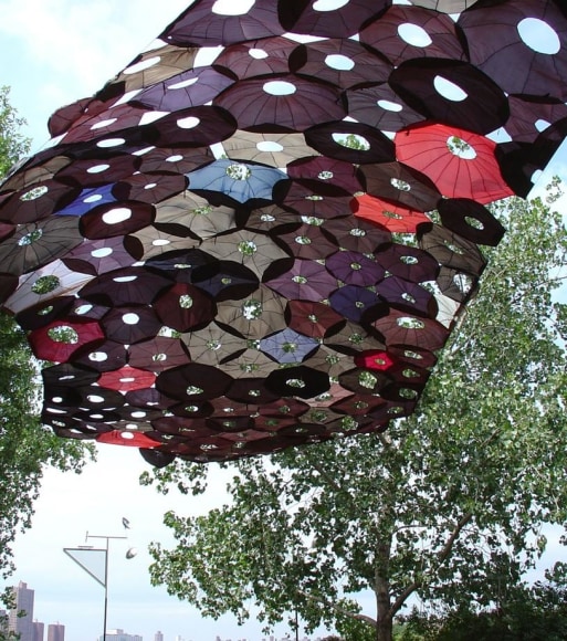 Penumbra , 2003 / broken umbrellas, thread, and cables / Socrates Sculpture Park, Long Island City, Queens, New York
