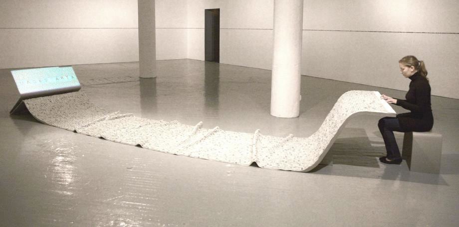 TEXTile, 2006 / 22,528 recycled computer keycaps and 192 custom keycaps, high performance laminate fabric and Spectra fibers, customized active keyboard and interactive software and painted aluminum armature / 31 1/2 x 48 x 245 inches / In collaboration with The Fabric Workshop and Museum, Philadelphia / Permanent collection of Fabric Workshop and Museum, Philadelphia, PA, 2006