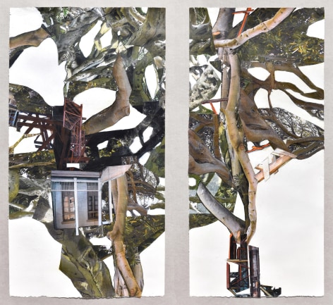 Jennifer Gunlock (American, b. 1972) explores the relationships between the objects of nature and those imposed upon them by human activity in her work. By layering photographs taken on her travels, decorative papers and drawing, she constructs tree-based forms which are awkwardly fused with architectural motifs. Each composition reflects a long passage of time in which buildings and trees stretch and crumble, each pushing against the other. The work is a commentary on humanity’s direct impact on the environment, as well as Earth’s interminable shapeshifting over the long history of its existence.