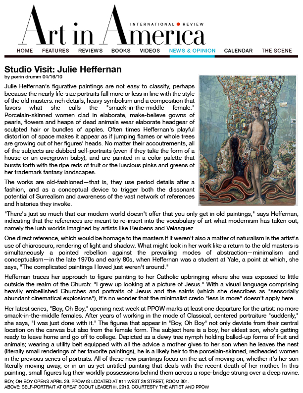 Akin to Magical Realism, Julie Heffernan's lush self-portraiture utilizes a myriad of art historical references to present a sensual interior narrative, a self-allegory whose half- hidden political agenda is the literal background of the paintings. The dark, Grimm fairy tale-like undercurrent transforms her aristocratic, operatic portraits into a contemporary vanitas or memento mori, acting as both a stylized fantasy and a Bosch-like warning.