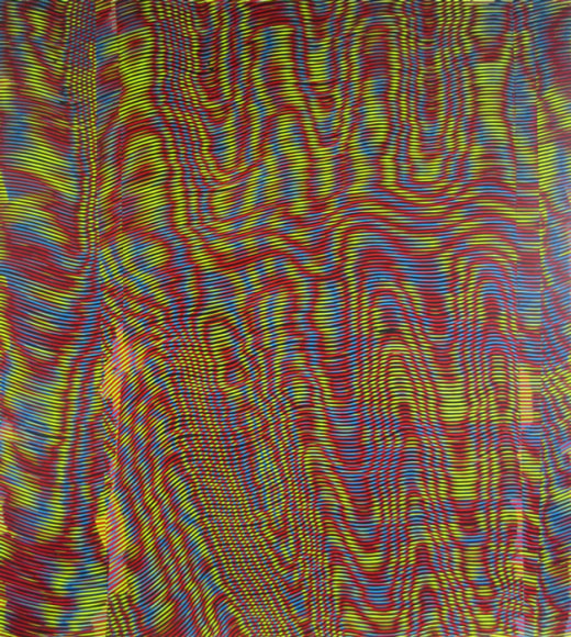 Julie Oppermann's work pushes the limits of visual perception, making paintings that are physically difficult to perceive. The scintillating effects arising through the calculated layering and juxtaposition of contrasting colors through repetitive line patterns elicit shuttering afterimages, optical flicker, and disorienting sensations of movement. The paintings, on one hand, reference the digital, looking as if they might be computer-generated, vector-based interference patterns; up close, however, they reveal a gestural, intuitive approach. Glitches, bleeds and mis-registrations rupture the illusory field of the moiré, creating visual noise and also highlight the basic tools at work: taped-off line patterns and paint on canvas. Where others approach ideas such as rasterization, pixelation, image compression, data loss and corruption primarily through the more obvious channel of digital media, Oppermann succeeds, instead, by effecting these phenomena directly through the medium of perception itself. The glitch, so to speak, occurs in the viewing of the work, by distorting the viewer's field of vision, and interfering with their ability to "see" and look at the painting.