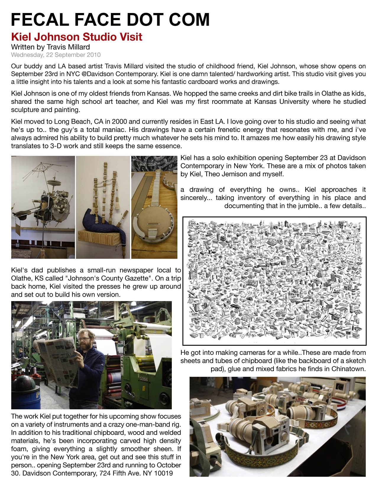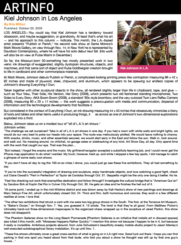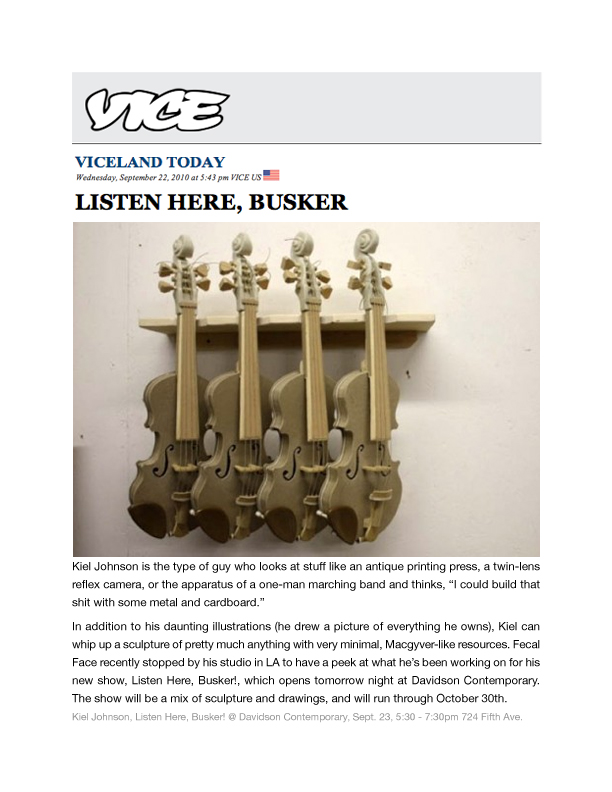 Kiel Johnson's drawings and sculptures tell tales; layered narratives speak of his travels and adventures through everyday life. His works become a springboard for metaphorical investigations of the world he inhabits. Although both factual fictions and absurd scenarios, they are ultimately testaments to observation that force us to question the concrete and truthful. What at first might appear safe and secure will be, upon further inspection, very precarious.