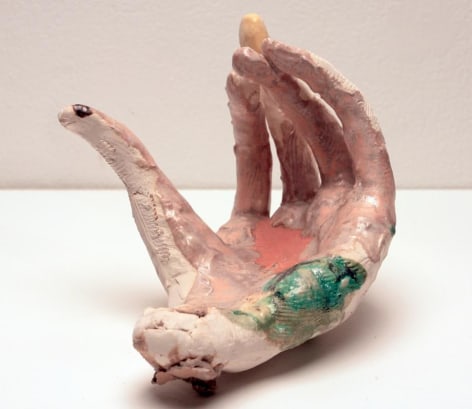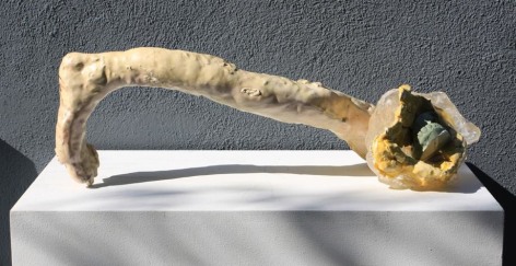 Using a traditional sculptural format (the monument), Meghan Smythe captures contradicting extremes within human gesture: intimacy and brutality, beauty and ugliness, or the lewd and tender. In her attempt to achieve an "elegant vulgarity," she encapsulates moments that define our mortality in unanticipated ways; oftentimes toeing the delicate line between erotic and macabre tendencies that give way to life, and ultimately death. Glass, ceramic, and concrete are woven together in an elaborate, orgy-like web of body parts and organic artifacts, as if suddenly cast with Pompeii-like circumstances. Like excavated antiquities or fossils, Smythe's ceramic compositions allude to the cyclical nature of civilization - a dramedy in which all of the players are subject to conquest and demise.