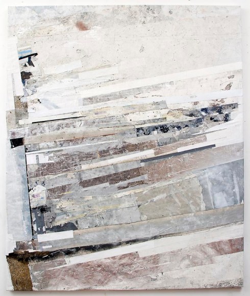 Redactor I, 2013 / enamel, acrylic, crystalina, glass powder, pigment, cold wax, glass film, tape, and vinyl on wood panel / 80 x 60 inches