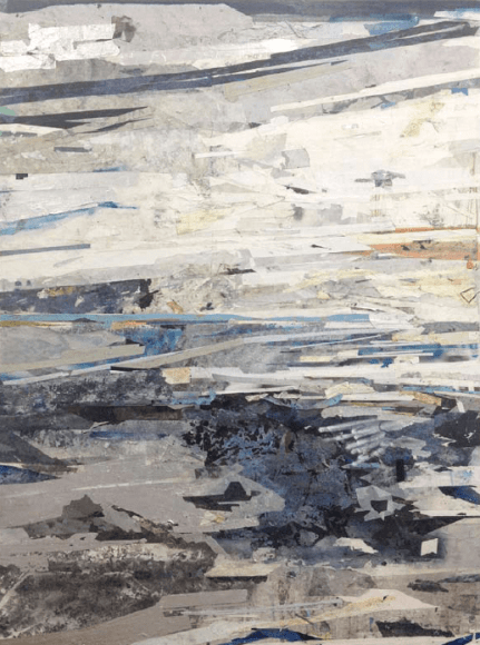 Redactor 1, 2014 / enamel, acrylic, crystalina, glass powder, pigment, cold wax, glass film, tape, and vinyl on canvas / 72 x 60 inches