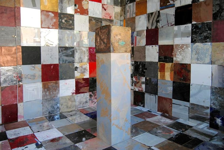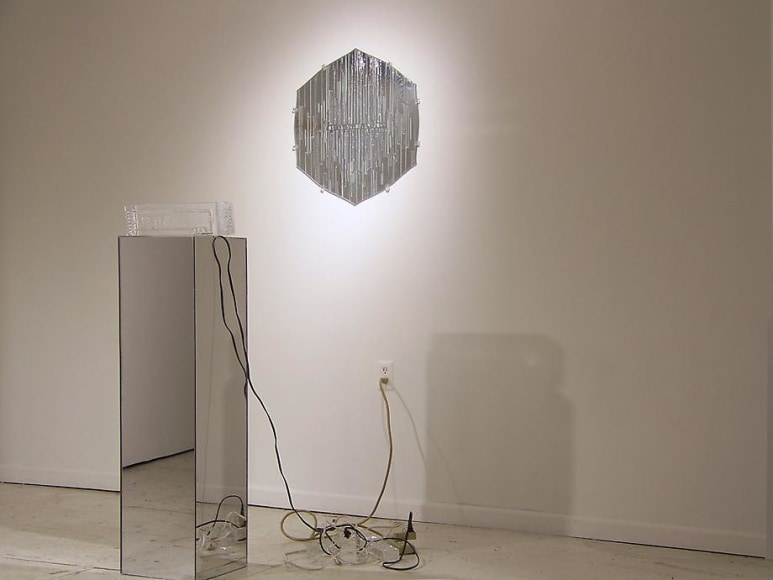 Estimated Time of Departure, 2011 / Ice, wire, surge protector, glass, Mylar, metalized Mylar tape, electric tape, paper clip, and mirrored Plexiglass / dimensions variable