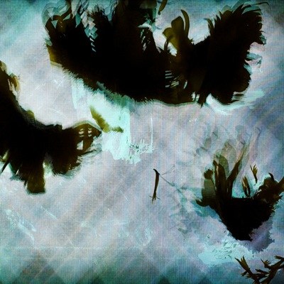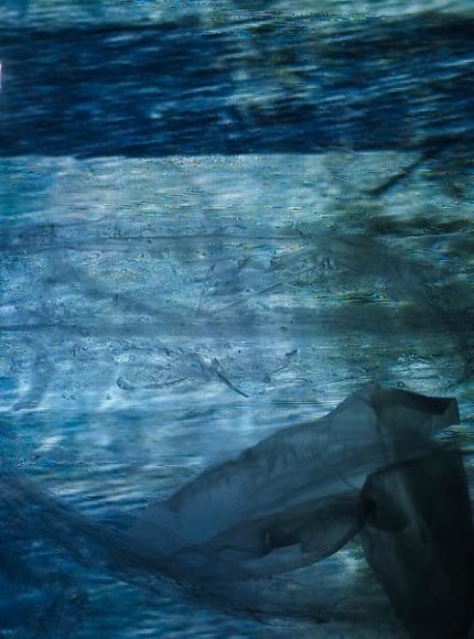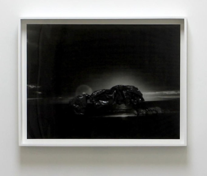 Here About 7, 2013 / Found photograph and trashbag / 33 1/2 × 43 1/2 in