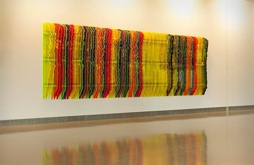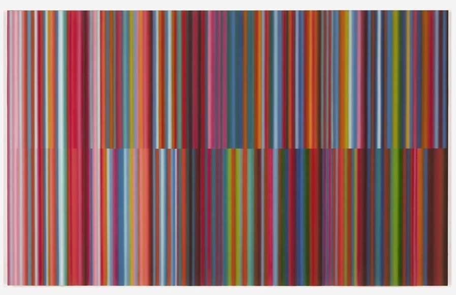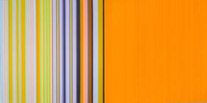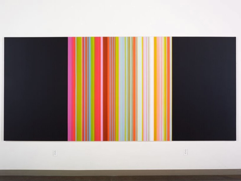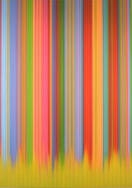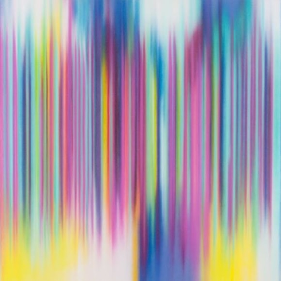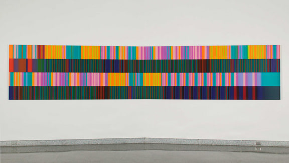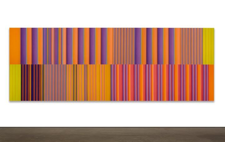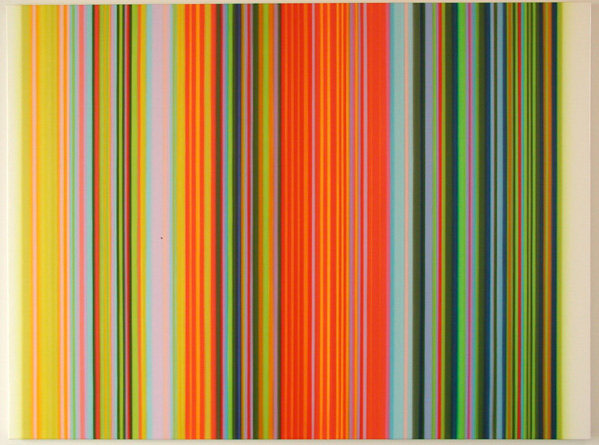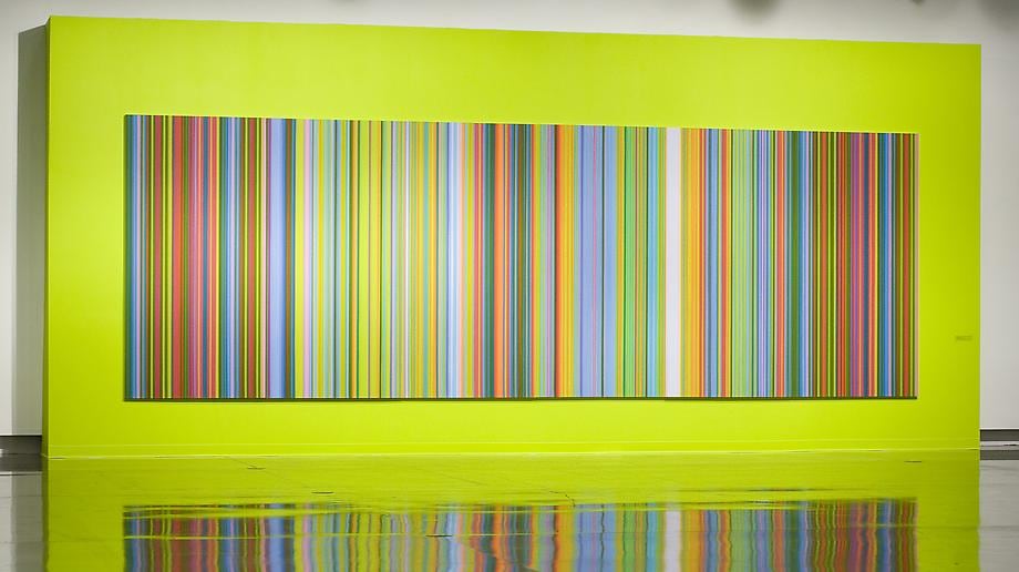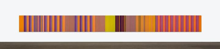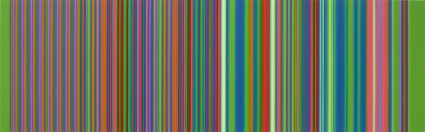 Music is the genesis of Tim Bavington's paintings. Through synthetic polymer paint, Bavington acts as a translator between the aural and the visual as he transforms guitar solos, melodies and bass lines into vertical bands of color. Tracks from bands such as The Beatles, The Jam, Oasis, and The Rolling Stones become vibrant bands of color, and bridge compositional concepts between seemingly unlike disciplines. Although Bavington has a method that designates sound to color and composition, the paintings are not literal translations; they remain open to intuition and decision-making, allowing for a distinct artistic presence.