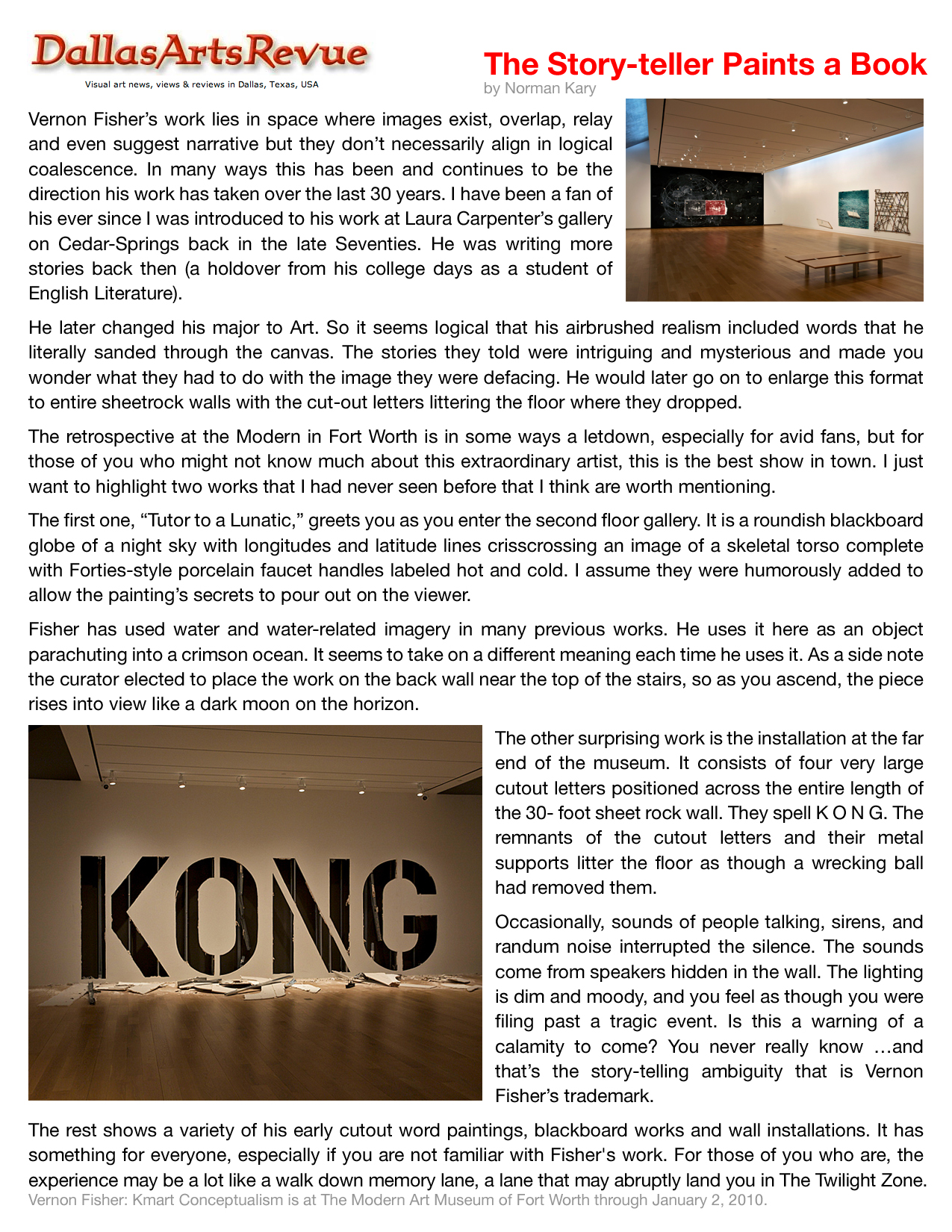The art of Vernon Fisher is included in the collections of more than 40 museums across the globe, such as the Hirshhorn Museum, Washington, D.C., Art Institute of Chicago, Modern Art Museum of Fort Worth, Phoenix Art Museum, Museum of Fine Arts, Houston, San Francisco Museum of Modern Art, Solomon R. Guggenheim Museum in New York and the Museum of Contemporary Art Chicago. The most important museum installation is in the collection of the famous Museum of Modern Art in New York.