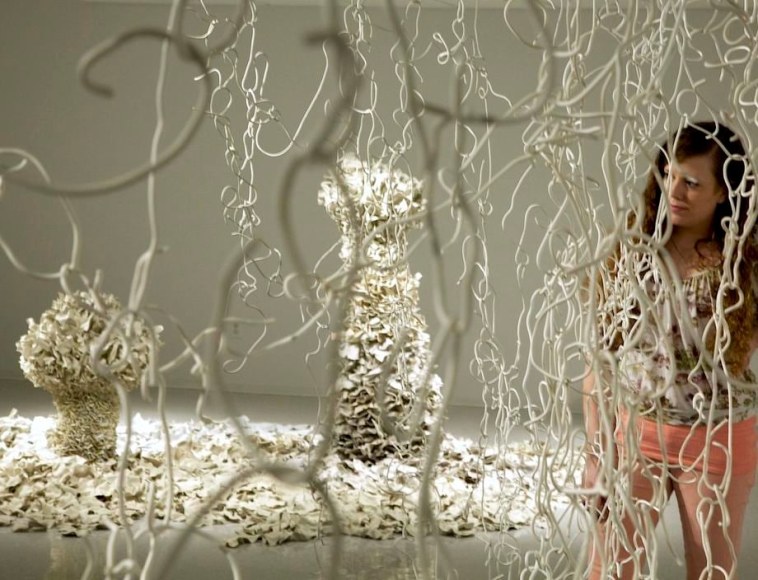Large Peony and Peeping Tom, 2014 / porcelain shards, clay, metal / 72 x 46 x 30 inches