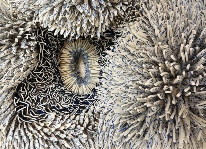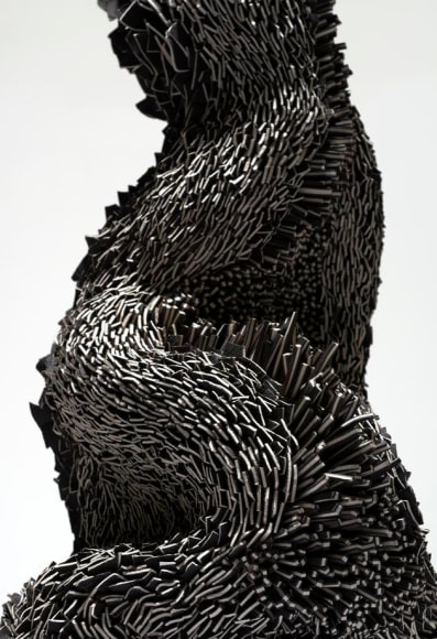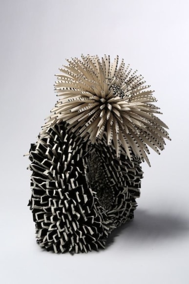 Her sculptures and installations consist of thousands of hand-crafted porcelain shards: a technique that yields a texture both delicate and severe. In some works, large-scale ceramic pieces appear airy, delicate, and fluffy, as if one's breath might break it. In others, Peled's fragments are geometric barbs that mysteriously take on an alluring form: offering a sense of softness despite a sharp actuality.