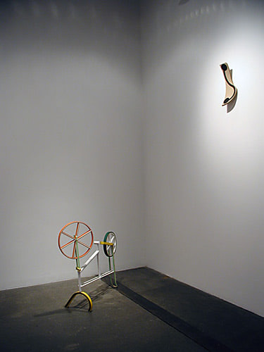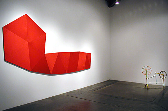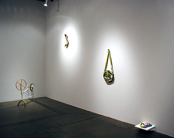 Brad Tucker’s paintings and sculptures tie together color-field painting, early modernist abstraction and a few—very American—loose ends. Playing in garage bands, going on tour, shopping in dime stores and witnessing the less organized aspects of our country are evident in the artist’s intentionally low-tech, ‘do-it-yourself’ pieces. Here the faded colors of thrift shop T-shirts, the shapes lawn ornaments and the closed patterns of skateboard ramps become the basis for abstract wall pieces, while overlooked objects like flip-flops, chunky 70’s headphones and guitar cases are re-cast and re-fashioned as sculptural objects.