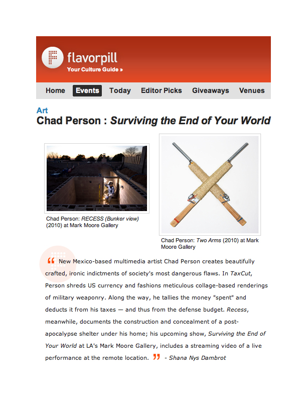 "New Mexico-based multimedia artist Chad Person creates beautifully crafted, ironic indictments on society's most dangerous flaws." – Shana Nys Dambrot, Flavorwire (2010)