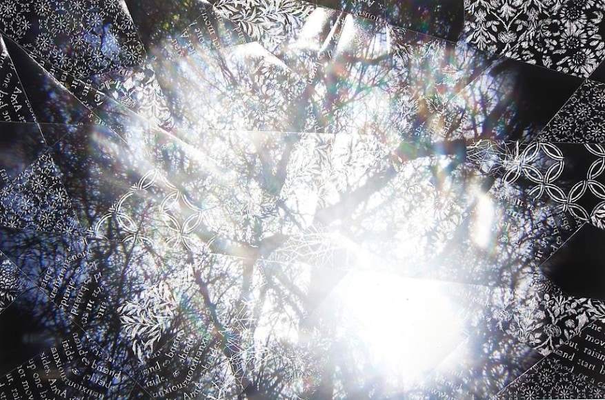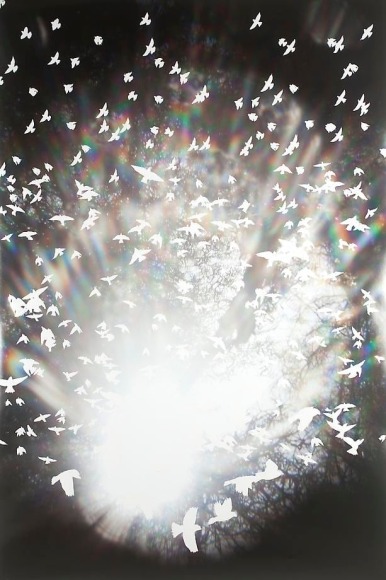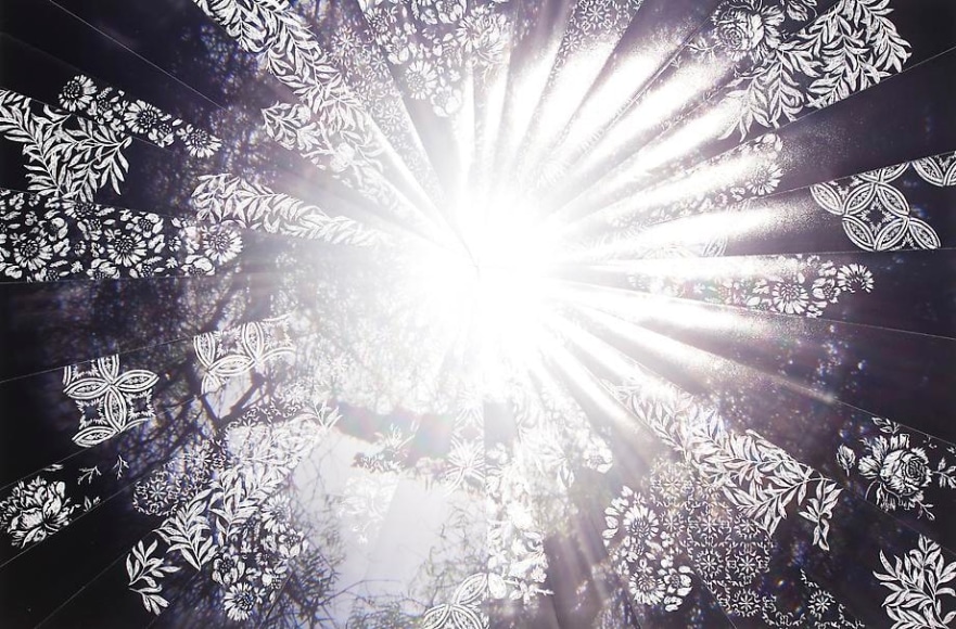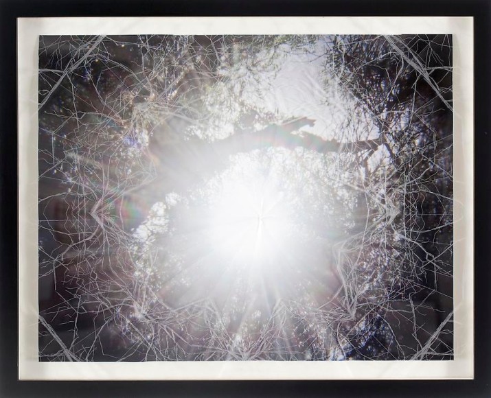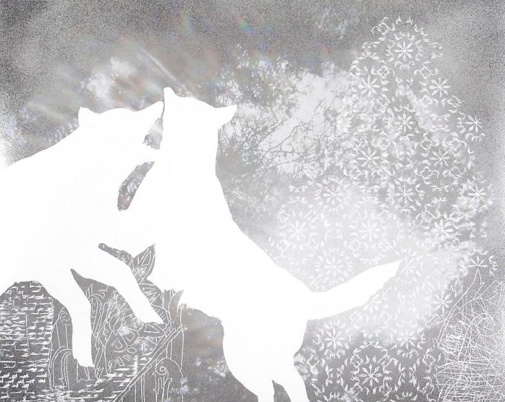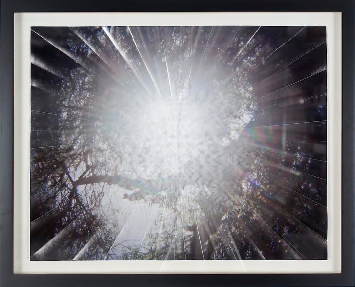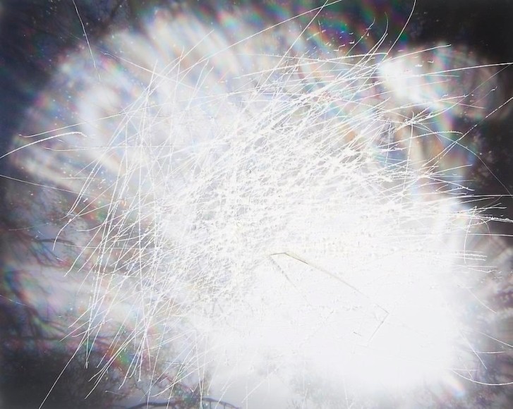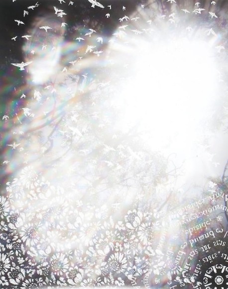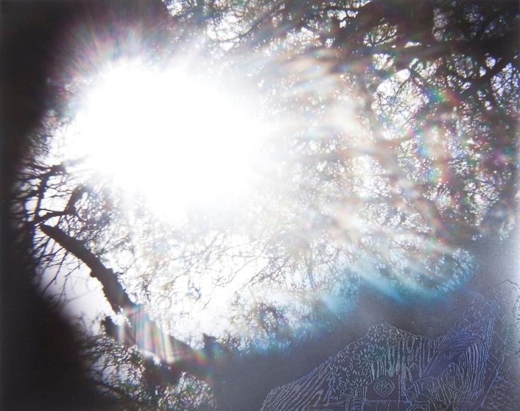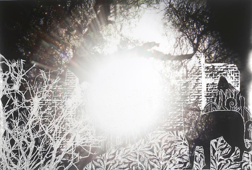 Countering the idea of the mass-produced novel and pervasive e-book, GRFALWKV harkens back to the handmade origins of bookmaking, imitating the illustrative qualities of crafted manuscripts while also recalling the visual language of contemporary materiality, literature, and design. Employing techniques of spray painting, collage, and fountain pen drawing, each page is meticulously transcribed by hand. Through this methodical process, Russell invites us to ruminate on the affects of mortality. The first chapter recalls scenes from Antichrist movies of the Cold War era, with illustrations alluding to environmental catastrophe. The next chapter delves into Edmund Burke's essay on terror as the ruling principal of the sublime, while the following chapter offers an imaginary glimpse into the aftermath of a nuclear blast. The fourth chapter “Dead Art Star” - deals with the art world as a catastrophic event in which ideals are traded and sold to the detriment of the artist's sense of self. The final chapter brings the text back to photographic seeing by offering brief descriptions of mundane scenes, and creates mental images that act as stages for potential traumas. Supplementary to the book are Russell's photographs of lens flares, rife with intricately scraped patterns and figures upon their surfaces. With a razorblade, Russell gouges stylized explosions and fragmented scenes of an apocalyptic aftermath into his images, creating a world in which animals have returned to re-inhabit the rubble left by these detonations. Simultaneously referencing death and rebirth, Russell's visual and written narrative guides us through the captivating, volatile nature of transience.