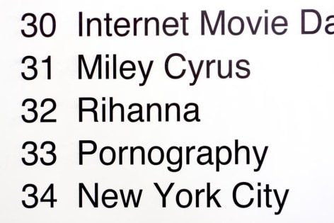Though technically accomplished, the works resonate most strongly through how they reflect our moment. With a critical eye, Salavon is attentive to mass culture as a ubiquitous language that inexorably displays the predilections, obsessions, and mannerisms of our time. In the piece "The Master Index," Salavon has created a master list of the five million most popular Wikipedia articles entries, summing up the internet’s interests in a comprehensive archive. The list itself becomes a bizarre visual artifact, with “Japan” situated between “Miley Cyrus” and “Selena Gomez," and “Human penis size” just following “Abraham Lincoln.” With a witty approach to contemporary computation, Salavon’s reductive methods reveal underlying currents—and absurdities—creating a body of work that feels like a wild ride through the collective digital consciousness.
