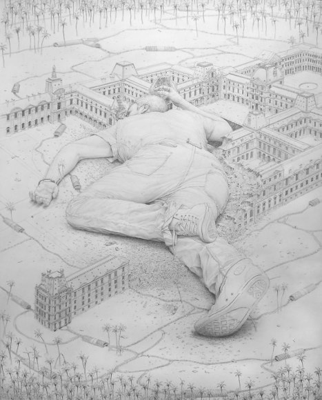 Roy's obsessive meticulousness is analogous to the objective of modernized globalization – no canvas remains bare as no frontier remains untouched. His compositional horror vacui is increasingly less science fiction than it is foreshadow, as infinite industrial horizons appear as foreign as sketches of the New World were once perceived. Though his tableaus appear largely unpopulated, Roy uses dilapidated structures and techno-iconography to express a Physicalist paradigm of the world. Alongside the remnants of an imperialist gluttony too large to sustain, Roy introduces a solitary figure of epic proportions – an allegorical projection of the artist himself as a world-building "giant." Drawing upon an art historical lineage, Roy recontextualizes Goya's colossus as a cipher for the insatiable search for ultimate knowledge. His figures underline the sublime and terrifying aftermath of a sociopolitical cupidity. Although he critiques the myth of an all-saving hero, Roy alludes to hope through the drama of a distant rising sun or luminous structures – as though salvation waits at the dawn of a collective enlightenment.