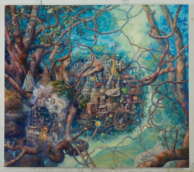 Mark Moore Gallery is proud to present Sky’s Falling, an exhibition of paintings by New York artist, Julie Heffernan. Marking the artist's second solo exhibition with the gallery, Sky’s Falling showcases the latest incarnations of an ongoing oeuvre of distinctive self-portraits in which quite interior worlds of personal symbolism are made exterior allegories. Despite their autobiographical quality, Heffernan's images proffer a larger discourse concerning our anthropocentric worldview – a sociopolitical attitude that has resulted in an ecological clash with nature.