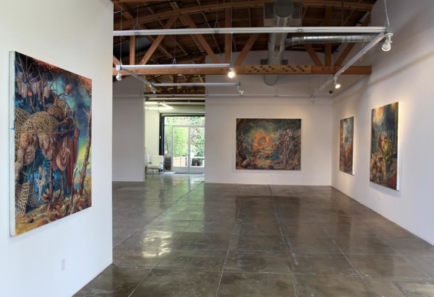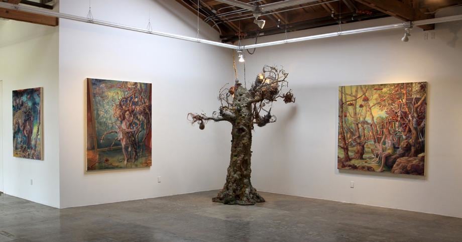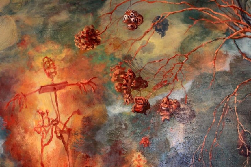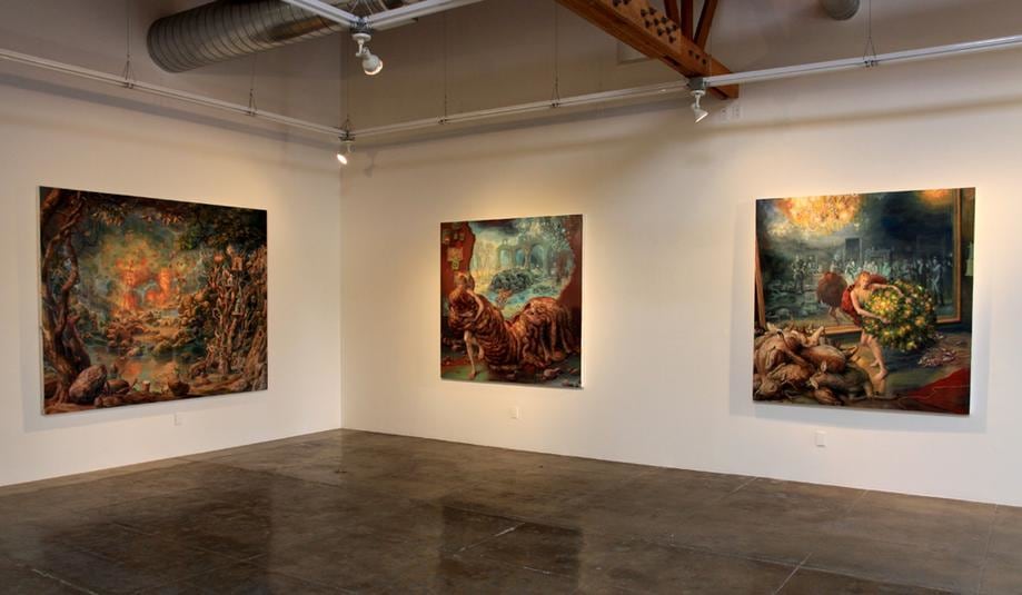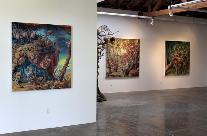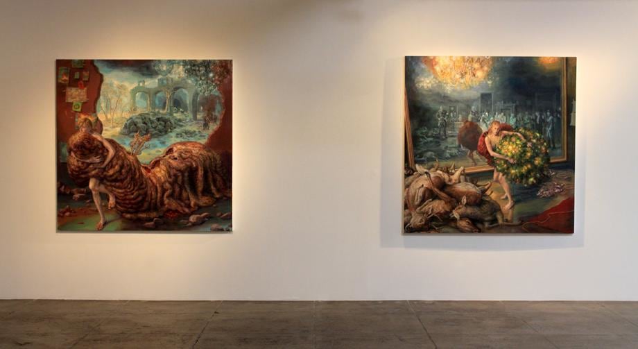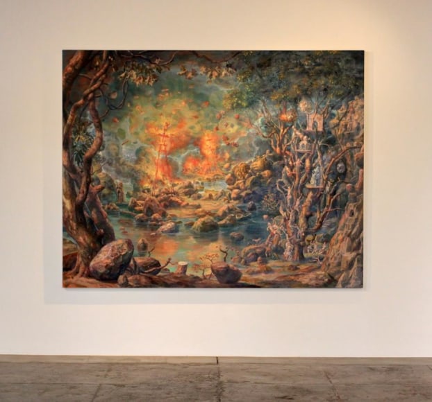 At the heart of the work is a palpable, grave concern for the environment. Issues of climate change, overpopulation and ecological imbalance are presented in highly ornate, dreamlike tableaux, rife with symbolism and allegorical implication. Although Heffernan’s compositions carry a clear reverence for the style and tradition of historical narrative painting, her imagery is not tethered to a specific genre, period or ideology, but rather blossoms directly from the imagination, expounding on Surrealism’s notion of the subconscious as the architect of reality.