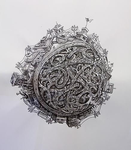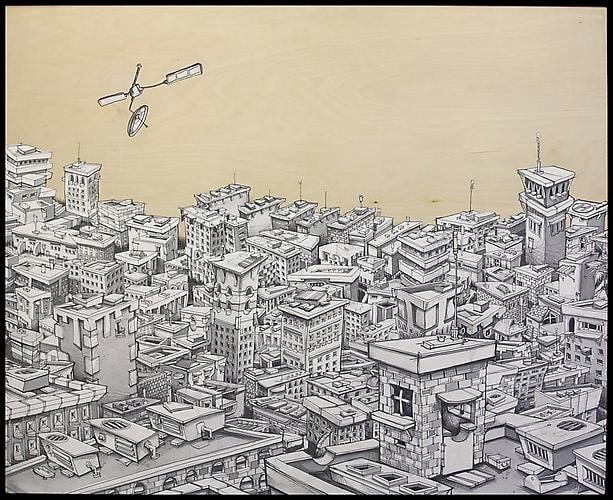 The relationship between Johnson and the crowded and impacted Port of Long Beach (where his studio is based) has influenced his 2D and 3D work as he addresses the nature of commerce and the individual. His interest in the dynamic between the alienation of the individual and the overabundance of things in the world, fuels his curiosity about how things work and the physical mapping out and making of things (both real and imaginary).