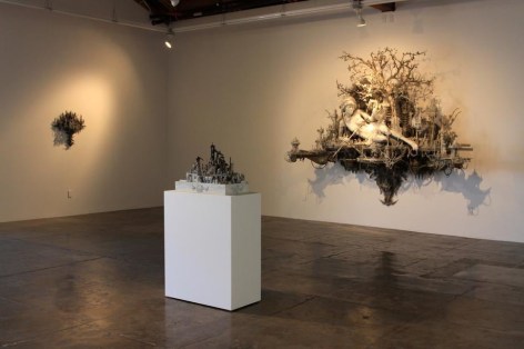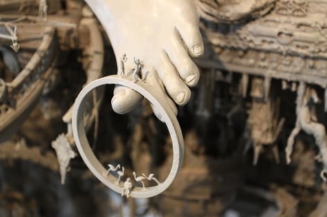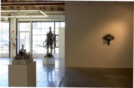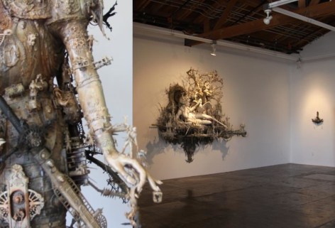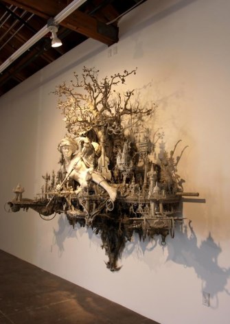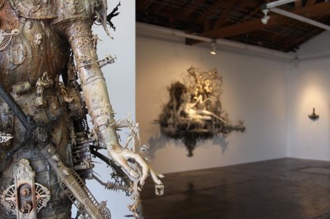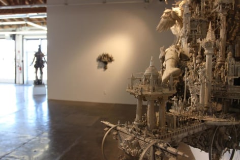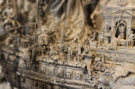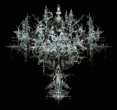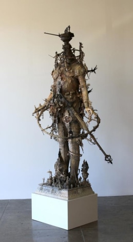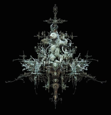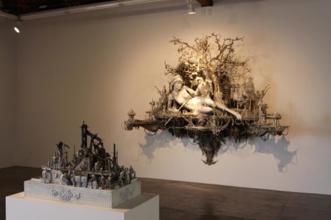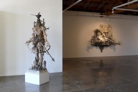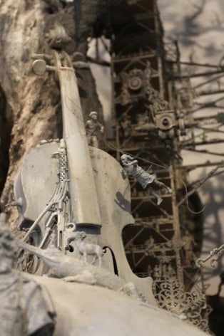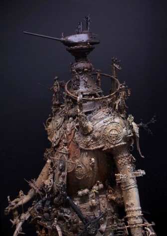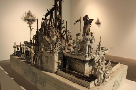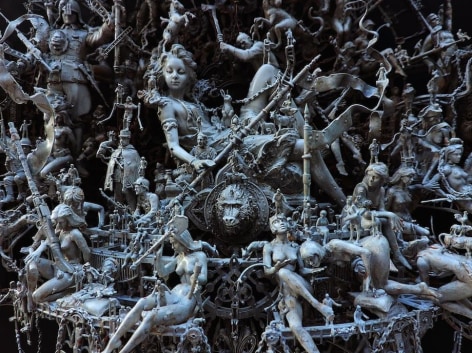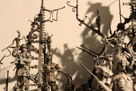 Kuksi’s ornate compositions call to mind the excessive intricacies of Art Nouveau or Baroque aesthetics. From a distance, these sculptures are deceptively decorative, but upon closer inspection Kuksi's grotesque realities emerge. In some works, central figures preside over mounting chaos below; infinitesimal creatures, soldiers, and machinery collide with their larger counterparts, and forge a warscape void of time and place. In others, Kuksi achieves a precise structural equilibrium in which his minute armies become a single enormous figure – as if the proverbial Trojan Horse is operated by its most aberrant inhabitants. Reminiscent of Hieronymus Bosch’s “Garden of Earthly Delights,” Kuksi’s characters inhabit a world rife with sin, corruption, and tragedy; an existence not so alien to our own.