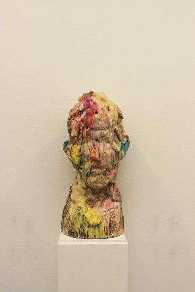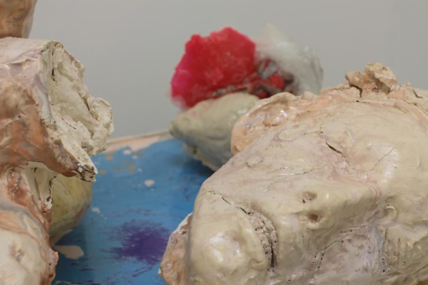Working within the tradition of the monument, the exhibition presents a theatrical choreography. Memories relating to youth, the familial, cyclical states, and chaos are made manifest through gesture and a fusion of contradictions. Smythe captures conflicting extremes within her compositions: intimacy and brutality, beauty and ugliness, or the lewd and tender. In her attempt to achieve an "elegant vulgarity," she encapsulates moments that define our mortality in unanticipated ways; oftentimes toeing the delicate line between erotic and macabre tendencies that give way to life, and ultimately death. Says the artist, "I work in and out of representation to find a visual lexicon where the weight of an archetype gives way. At this breaking point, lunacy meets levity and the indulgent narrative falters, turns back on itself, and is ultimately undone." Glass, ceramic, and concrete are woven together in an elaborate, orgy-like web of body parts and organic artifacts, as if suddenly cast within Pompeii-like circumstances. Like excavated antiquities or fossils, Smythe's glazed materials allude to the recurrent nature of civilization, and our perpetual hunt for the sublime - a dramedy in which all of the players are subject to conquest and demise.