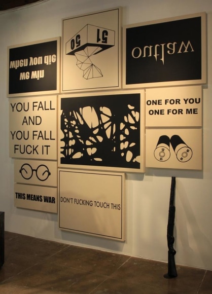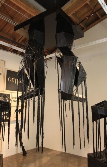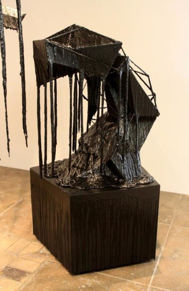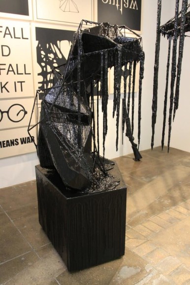 The focal points of the exhibition are two large-scale, wall sculptures entitled Campfire Barricade (2013-2014) and Debris Pile (2013-2014). Referencing apocalyptic tableaus captured in popular sci-fi motion pictures, these two sculptures resemble three-dimensional excavations of war barricades. Unlike Gordon Matta-Clark, who was interested in metamorphic gaps and dismantled architectural structures, Daniels is attracted to the dark, violent, biomorphic outcome manipulated in the existence of similar structures. His sculptures capture the slow and static moment of collapse and decay. Daniels continues his investigation into the breakdown of the practices and principles of construction through Painting With A Shotgun (2014) and The Grand Morphosis (2014). The collapse Daniels refers to is similar to the rise-and-fall of the Pruitt-Igoe urban housing project in St. Louis, Missouri. Shortly after its completion in 1954, the urban housing project began to decline due to overcrowding, crime, and economic restraints resulting in an epic demolition. The project has become an icon of failure through its advocacy of urban renewal and public policy planning. In Painting With A Shotgun, Daniels creates a cluster of archetypical images and text on canvas in response to these architectural and public policy catastrophes. The artist also makes reference to the L.A. architecture, and how its iconic buildings have become the voice and export of the city. The four sculptures that make up this body of work are Daniel’s observation on a building’s reaction to the psychological temperament of a space in which it inhabits. Much like the Pruitt-Igoe project, Los Angeles has been through many revitalizations and deteriorations. It is through these series of works that Daniels regards the lifecycle of architectural structures through the progress and decline of the environs around it.