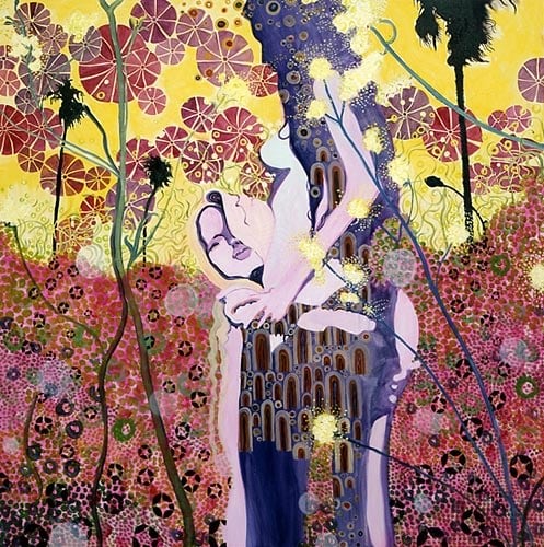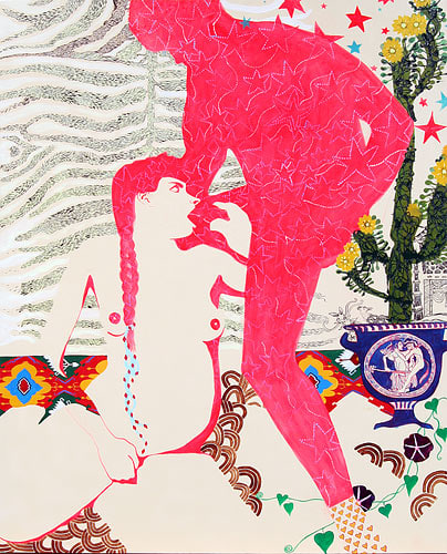 Samantha Magowan's paintings explore mass media imagery, in particular those of travel photography and pornography. Attentive to the mediated nature of these images, Magowan provides her own interference, using richly patterned surfaces -- reminiscent of those of Gustav Klimt -- and formal playfulness to veil the people depicted in her work. Functioning like ben-day dots or television pixels, Magowan's patterns figure and shape her subjects.