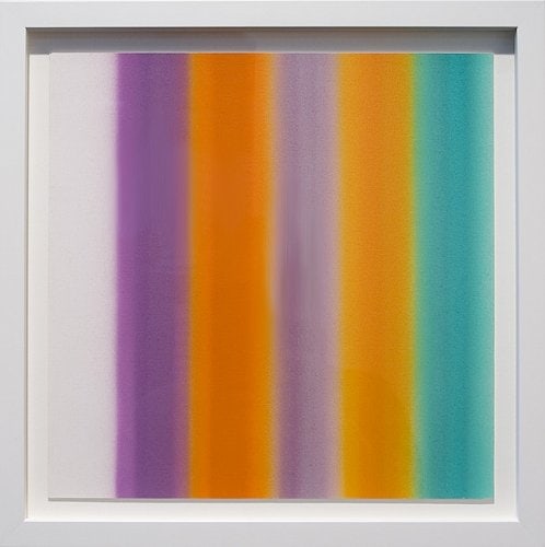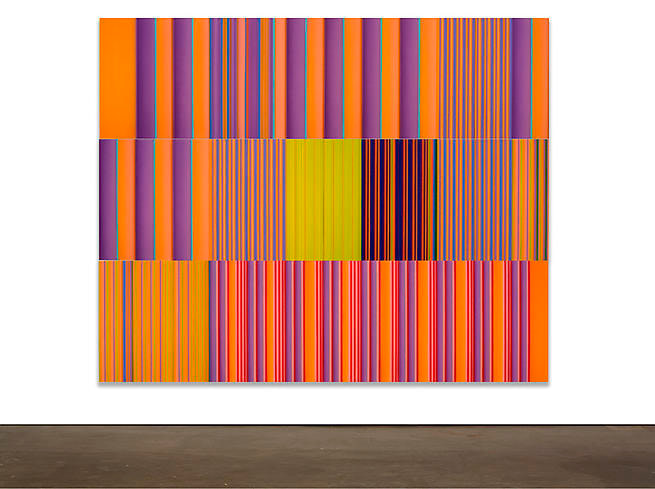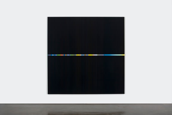 Bavington's use of a spray gun in place of a brush allows him to remove his presence from the canvas; this impersonal element feeds into the paintings resemblance to neon barcodes, echoing the glossy commercialism and hardened consumerism of his hometown, Las Vegas. But whatever you want to conceptually glean from Bavington's paintings it will - as with songs - largely become secondary to the sensory pleasure of experiencing them, the viewer immersed in color, freeing the imagination to shift with the pace of each riotous shade.