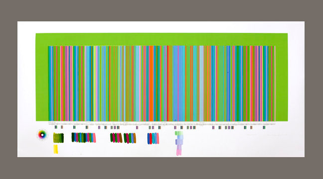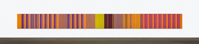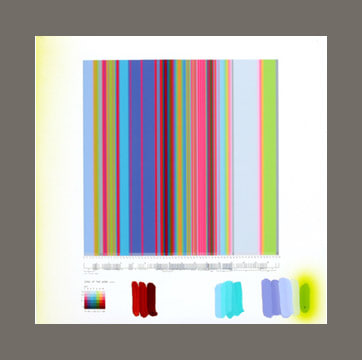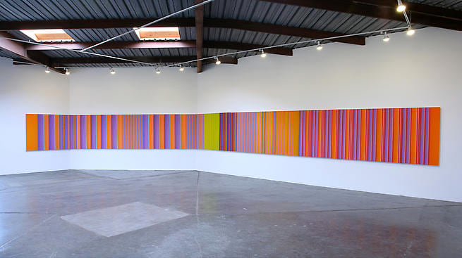 Mark Moore Gallery is pleased to present new paintings and works on paper by critically acclaimed artist Tim Bavington. Widely heralded for transforming stripe painting from a dead, forgotten style into a vivid, sexy and enthralling art form, Bavington shapes the potentially lurid and gaudy into the beautiful. His predominantly horizontal canvases boast varying vertical bands of near vulgar color, yet his seeming abstraction is grounded in recognizable songs; Bavington assigns notes to shades, translating music into color and form. He perfectly orchestrates these visual tones, the slight blur of each transition causing the hues to hum and vibrate from the surface. The resulting images emerge as pulsating heart monitors whose hectic energy floods across the canvas, the rigor of which the eye must rush to keep up with.