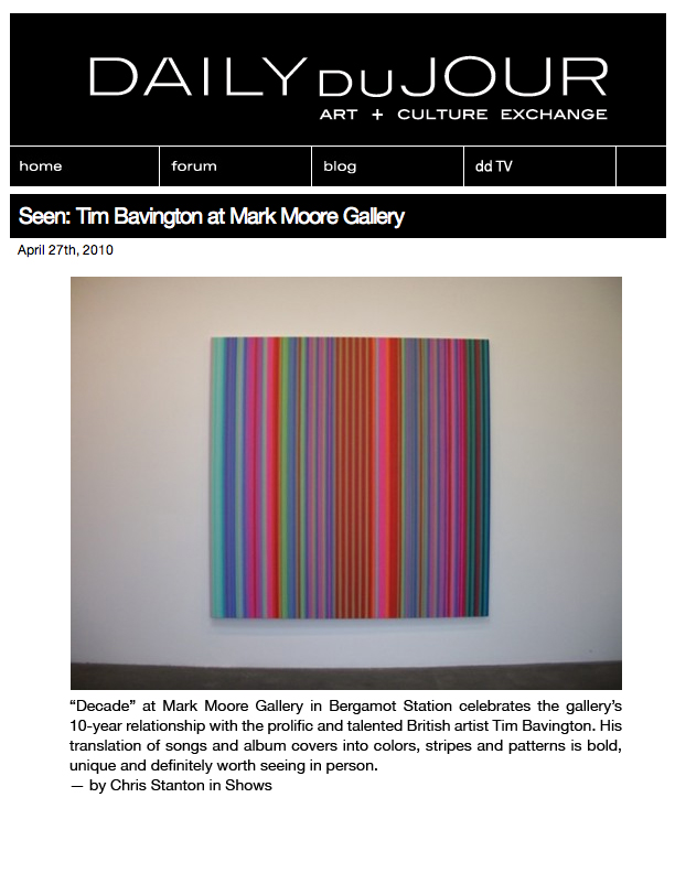 Mark Moore Gallery is thrilled to announce its fifth solo exhibition of new work by painter Tim Bavington. Marking Bavington's tenth year of representation by the gallery, "Decade" will feature a distinctive new body of work in addition to his iconic striped paintings and variations thereof.