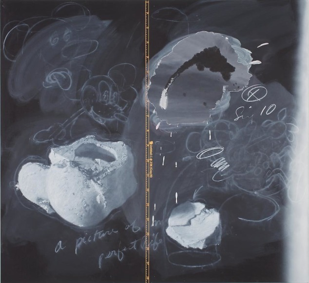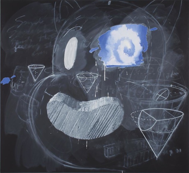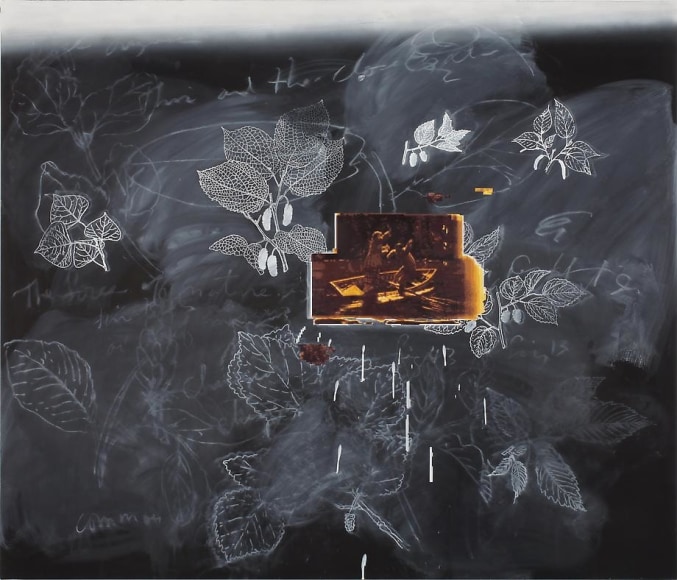 Fisher's preoccupation with archive, information transmission, memory, and taxonomy stems from an early interest in how people make sense of the world. His hallmark blackboard paintings recall pedagogical lessons or speculative renderings, oftentimes replacing sequential logic with "disordered notations" analogous to excerpts from an unrepressed mindscape. Often weaving literary references, pop cultural imagery, and cartography with his own symbolic lexicon, Fisher renounces the convention of a singular, autonomous narrative in favor of a seemingly endless metonymic chain. Often contextualized within a postmodern lineage, Fisher's work shares affinities with Cy Twombly and Robert Rauschenberg, as expounded in Frances Colpitt's monograph essay for Vernon Fisher (University of Texas Press, 2010) – which was produced in tandem with Vernon Fisher: K-Mart Conceptualism, his career retrospective at the Modern Art Museum of Fort Worth.
