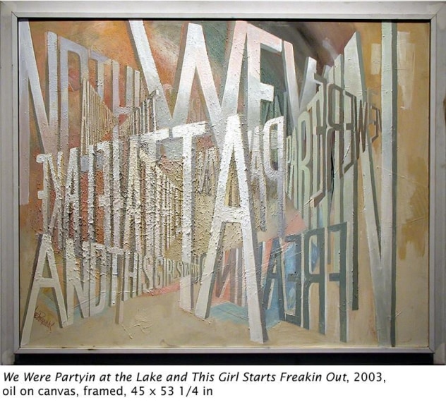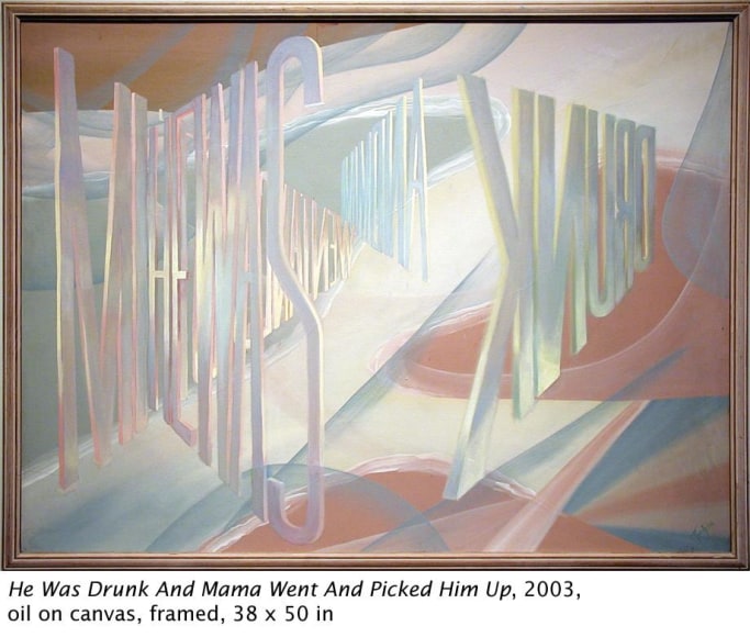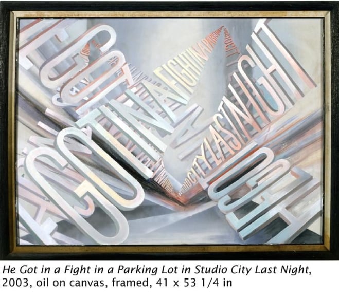 The Mark Moore Gallery is proud to present the second solo exhibition by Los Angeles artist Wayne White. The show is comprised of four large abstract oil paintings, originally found in thrift stores, and reworked in to one sentence story/images. His new word paintings forge in to ’beige’ America – the suburban miasma, as smart, acerbic, and down home narratives such as, “Wrapped Round A Pole In Pomona For All I Know”. There are no picture perfect lawns or swimming pools as subjects in these works - only fights, car wrecks, and too much liquor. As complex images, the paintings draw upon a host of historical references, from the Futurist painters of the early 20th century, to modernist architecture, and contemporary television advertising.