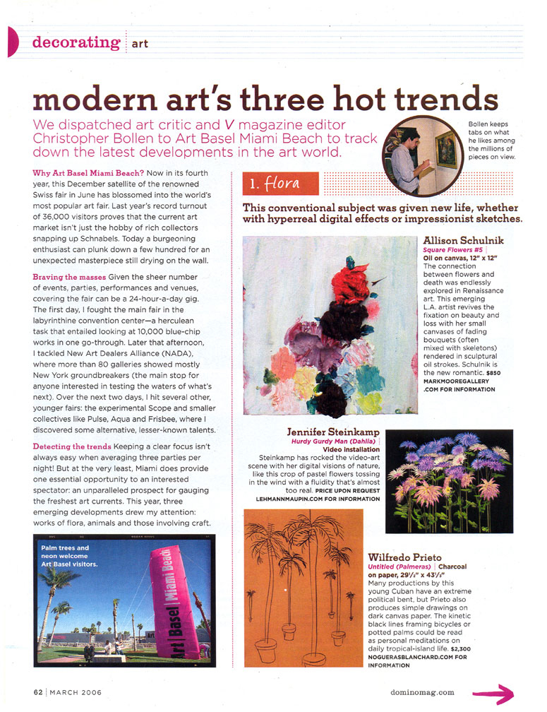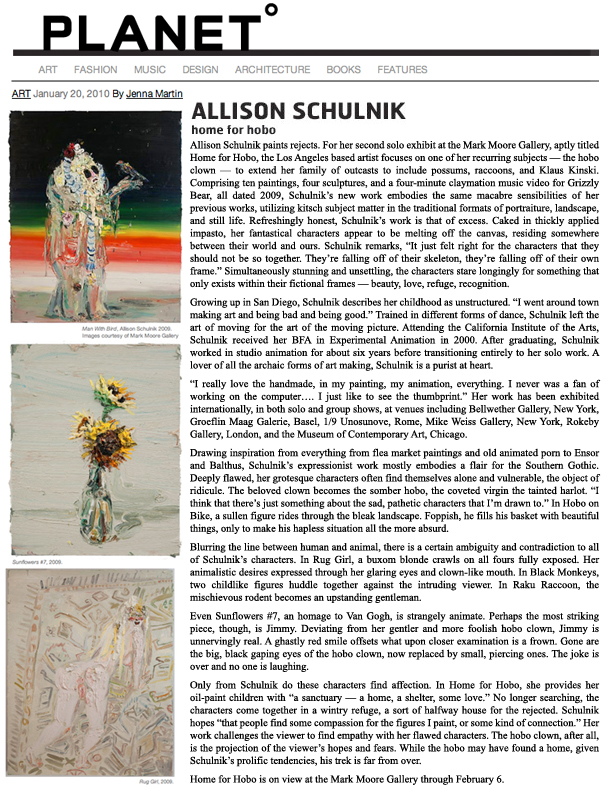 Solo exhibitions include the Wadsworth Atheneum Museum of Art, Hartford, CT; Laguna Art Museum, Laguna Beach, CA; Oklahoma City Museum of Art, OK; Nerman Museum of Contemporary Art, Overland Park, KS; Mark Moore Gallery, Los Angeles; ZieherSmith, New York, NY; and Galeria Javier Lopez & Fer Frances, Madrid. Schulnik's work is in the public collections of the Los Angeles County Museum of Art; Museum of Contemporary Art San Diego; Santa Barbara Art Museum; Museé de Beaux Arts (Montreal); Laguna Art Museum; The Crocker Art Museum; Wadsworth Atheneum Museum of Art; and The Albright-Knox Gallery; Marjorie Barrick Museum (University of Nevada Las Vegas)- to name but a few. She lives and works in Sky Valley, CA.