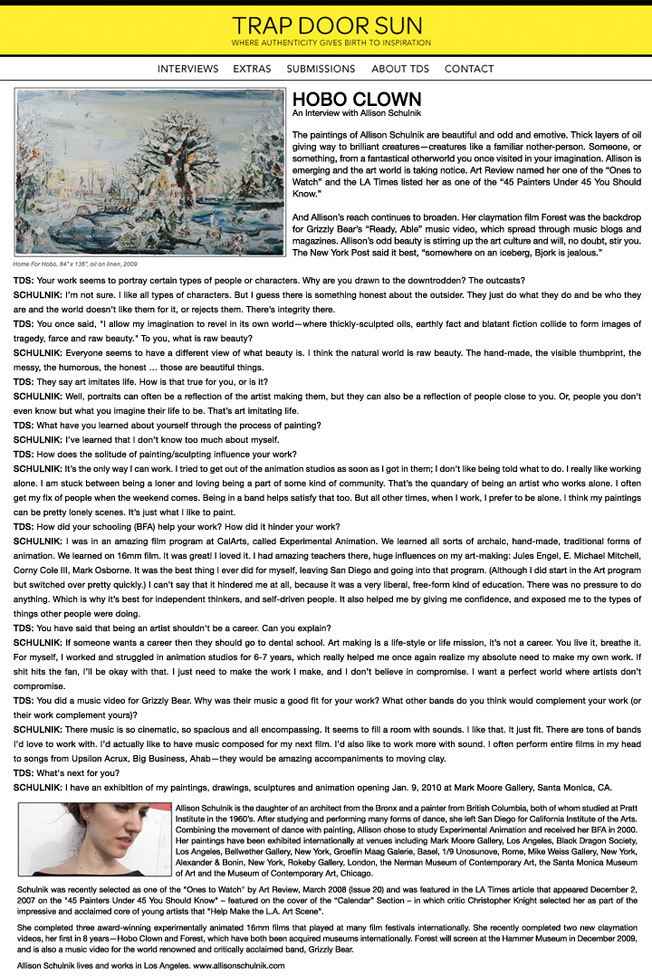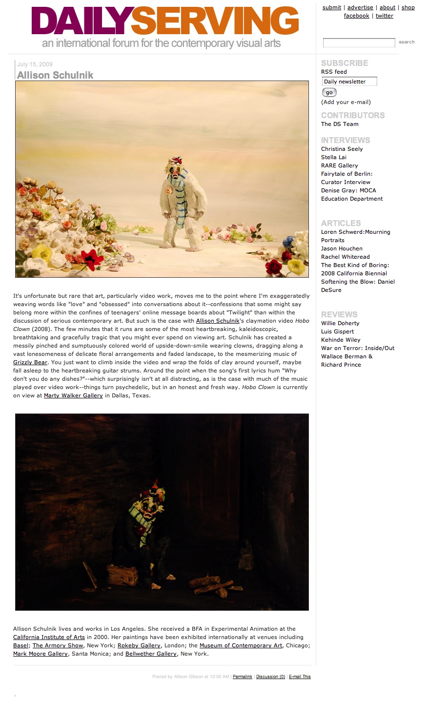 Schulnik has been making animated films since she was 17. Her films have been included in internationally renowned festivals and museums including the Hammer Museum, Los Angeles, LACMA, Annecy International Animated Film Festival and Animafest Zagreb. She received “Best Experimental Animation” at the Ottawa International Animation Festival and Special Jury Prize at SXSW FIlm.