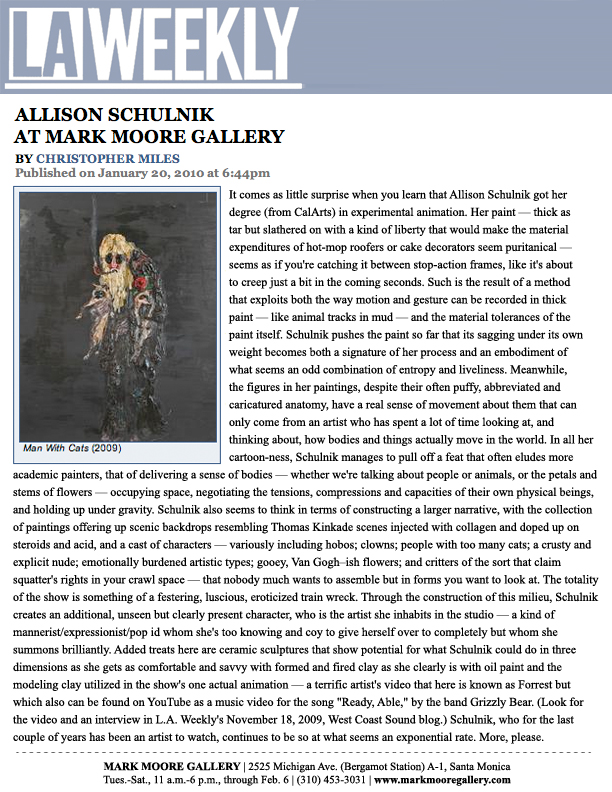 Allison Schulnik uses painting, ceramics, and hand-made, traditional animation to choreograph her subjects in compositions that embody a spirit of the macabre, a Shakespearean comedy/tragedy of love, death, and farce. Her works were compared to "the comic-grotesque visionary James Ensor" by The New York Times.