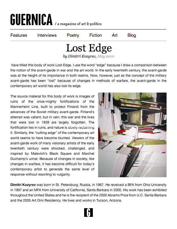 “I maintain that just as the concept of the military avant-garde has been ‘lost’, because of changes in methods of warfare,” Dimitri Kozyrev says, “the avant-garde in the contemporary art world has also lost its edge.” Kozyrev was born in the U.S.S.R., where the history and mental impact of war was as ingrained in his surroundings as it is dominant today in his subject matter. In St. Petersburg, Kozyrev lived in the wake of the totalitarian regime of Joseph Stalin; he was no stranger to landscapes destroyed by the military and likewise, the censorship of the avant-garde movements. Today, Kozyrev paints these landscapes, rearranging the pictorial space in a reference to modernist movements like Constructivism (censored by totalitarian regimes) and portraying the landscape’s ability to heal its own wounds.
