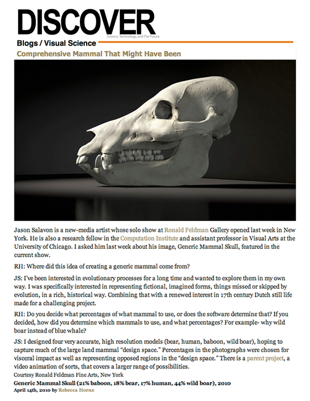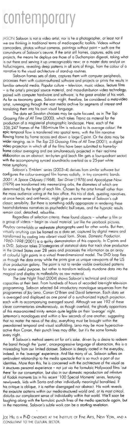 Using software processes of his own design, Jason Salavon generates and reconfigures masses of communal material to present new perspectives on the familiar. Though formally varied, his projects frequently manipulate the roles of individual elements derived from diverse visual populations. This often unearths unexpected patterns in the relationship between the part and the whole, the individual and the group. Reflecting a natural attraction to popular culture and the day-to-day, his work regularly incorporates the use of common references and source material. Often, the final compositions are exhibited as art objects – such as photographic prints and video installations – while others exist in a real-time software context.