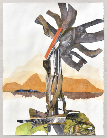 "In her mixed media collages, Gunlock explores the restless intersection of nature and the built environment. She depicts trees with rugged branches and burly roots wrangling with residential facades, windows, gates and other architectural features. Gunlock captures a fleeting moment in this struggle, one in which nature and architecture seem to co-exist in a colorful equilibrium, if only for a moment. Gunlock alludes to historical patterns of overshoot, which are marked by excessive demand for natural resources, followed by eras of human decline and the slow recovery of forests and ecosystems. But in these works, Gunlock offers a vision of a hopeful future in which the built environment is woven sustainably into the natural world."